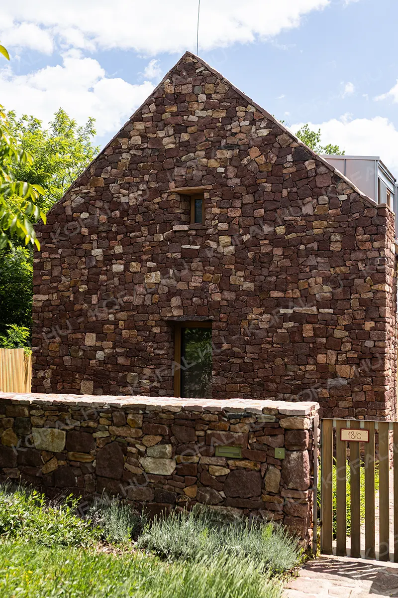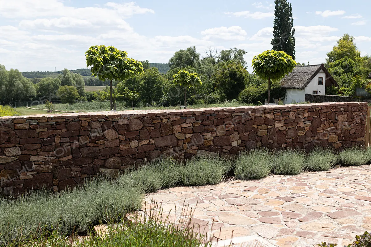 Szintkülönbséges telkeknél a Balatoni vörös falazókő támfalnak is nagyon jó, mert a kő tömege és a fal vastagsága stabil, és a felület esztétikája miatt a támfal nem „kényszermegoldás”, hanem látványelem lesz.
