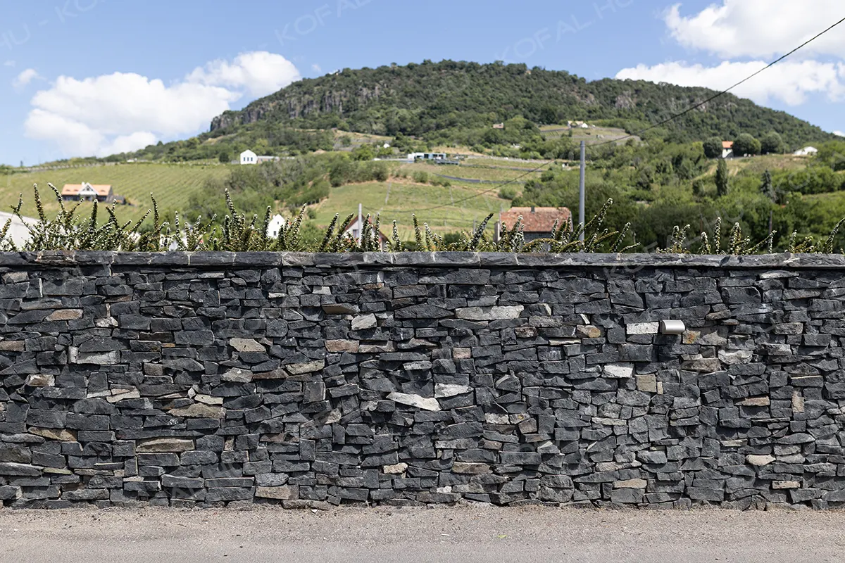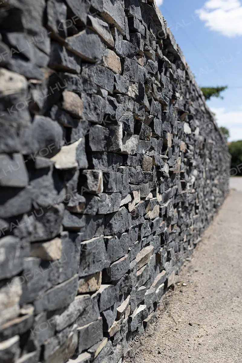 A Bazalt vágott mediterrán kő kerítésen hozza az egyik legerősebb vizuális hatást. A sötét tónus masszív, stabil, „prémium” érzetet ad. Ráadásul kerítésnél sokszor elég: